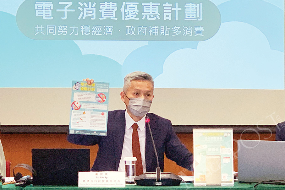 Economic and Technological Development Bureau (DSEDT) Director Tai Kin Ip shows reporters posters of the new electronic consumption benefits plan at yesterday’s press conference at the Government Headquarters in Nam Van. Photo: Prisca Tang