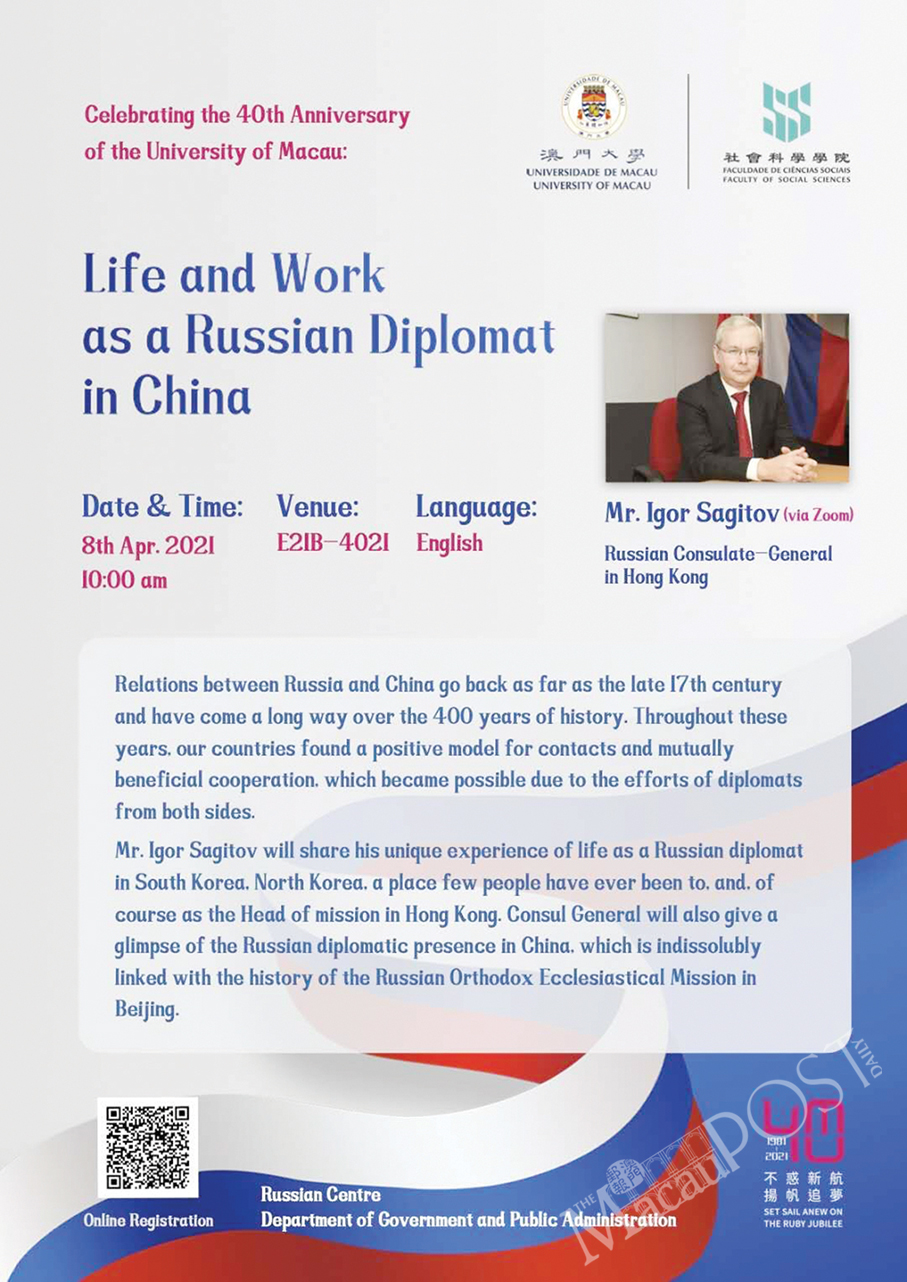 Last fall, on October 29, 2020, as the university began to return to a new normal, the Russian Center showed the Sergei Eisenstein classic silent film Oktyabyr (October) to a room that had as good an attendance as possible, given social distancing regulations. Given the fact, that the border between Hong Kong and Macao remains indefinitely closed, the Center decided to run a lecture-series utilizing the new technology Zoom. This way we are able to bring speakers from around-the-world at no extra cost. On April 8, Consul-General Sagitov gave a fascinating talk from the Consulate in Hong Kong on his life as a Russian Diplomat in China to a large audience of faculty and students. On April 16, in honor of Cosmonautics Day, commemorating that date in 1962, when Yuri Gagarin became the first person to go into Space, Prof. Joanna Radwanska-Williams from the MPI-Bell Center of English at Macao Polytechnic Institute, personally spoke on the Russian-American Space Race during the 1960s. Then on April 20, Prof. Oscar Sanchez-Sibony, returned via Zoom, and spoke on “Marxism and Bolshevik Visions of Utopia” to an audience of postgraduate and undergraduate students. On April 28, we showed another Sergei Eisenstein classic film, Alexander Nevsky,. Next week, on May 12, Prof. Vladislav Zubok, a full professor in International History at the London School of Economics, will speak to us from Moscow on his forthcoming book on the decline and fall of the Soviet Union, which is being released this summer. Prof. Zubok is one of the world’s leading authorities on the Cold War and recent Soviet history. Last, but not least, on June 7, Dr. Kirill Barsky, a senior official for the Asia-Pacific Economic Cooperation Forum (APEC), former Russian Ambassador to Thailand, and a Professor of International Relations at Russia’s leading International Relations University, will speak to us from Moscow on Russian-Chinese Relations. We are all looking forward to Dr. Barsky’s talk, which will close out our academic year at the Russian Center. We are also looking forward to a full fall program of events, when we hope the borders will, once again, be open. – UM