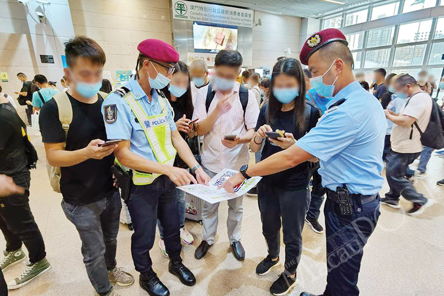 Public Security Police (PSP) officers help travellers convert their Macau Health Code to the Guangdong Health Code on their smartphones at the Barrier Gate border checkpoint on Saturday. Photo: PSP