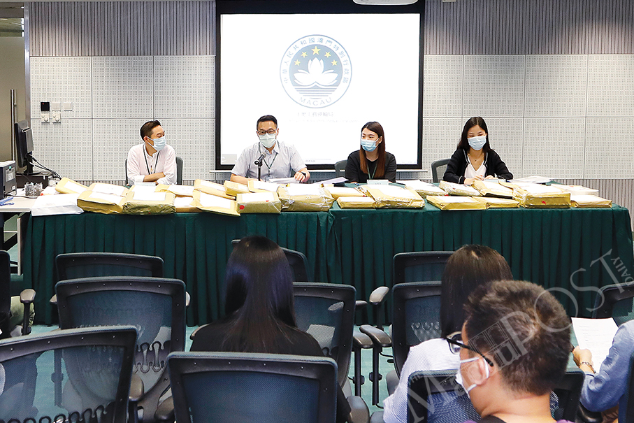 Lands, Public Works and Transport Bureau (DSSOPT) officials unseal bids submitted by construction companies for the renovation project of the Services Platform Complex for Commercial and Trade Cooperation between China and Portuguese-speaking Countries yesterday. Photo: DSSOPT