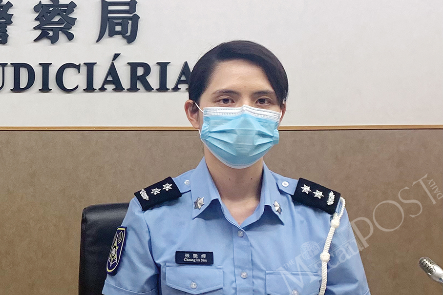Public Security Police (PSP) spokeswoman Erica Cheong Im Sim poses during a regular press conference at the Judiciary Police (PJ) headquarters yesterday. Photo: Camy Tam