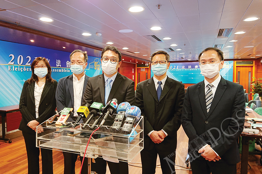 Legislative Assembly Electoral Affairs Commission (CAEAL) President Tong Hio Fong (centre) briefs reporters yesterday after a closed-door meeting of the commission at the Public Administration Building in Rua do Campo, as fellow commission members Inês Chan Lou (first from left), Iong Kong Leong (second from left), Lai U Hou (second from right) and Kou Peng Kuan look on. Photo: Tony Wong