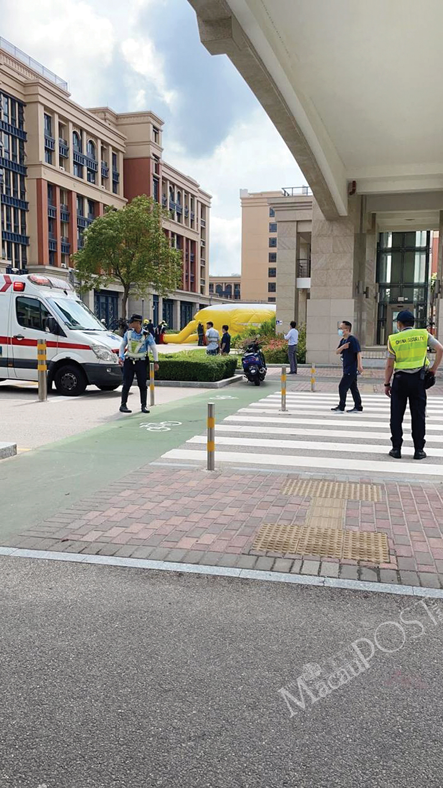 A rescue cushion is prepared outside a newly-completed residential college building on the University of Macau (UM) campus in Hengqin yesterday afternoon when a woman threatened to jump from its roof over a pay row. Courtesy: TDM