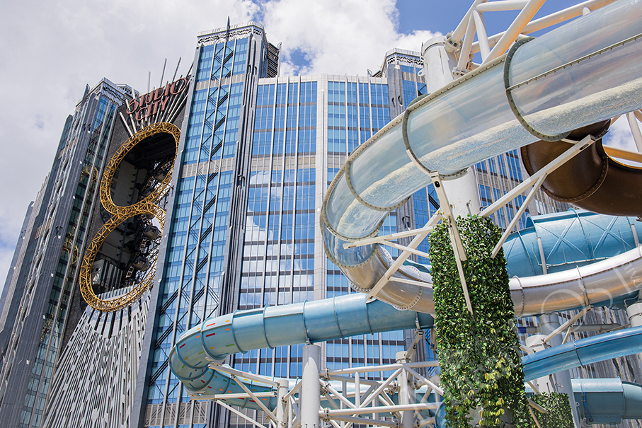 This handout photo provided by Melco Resorts & Entertainment Limited on Saturday shows the exterior of Studio City with one of its slides at the water park.