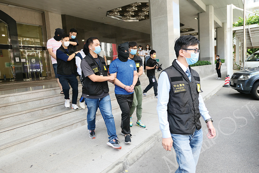 The three hooded suspects are escorted by Judiciary Police (PJ) officers from the PJ headquarters to a PJ vehicle yesterday. Photos: Iong Tat Choi