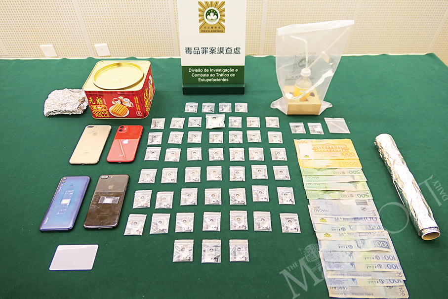 In the operation, the Judiciary Police seized 49 packets of cocaine weighing 27.12 grammes and two packets of ice weighing 0.67 grammes with an estimated street price of 90,000 patacas.