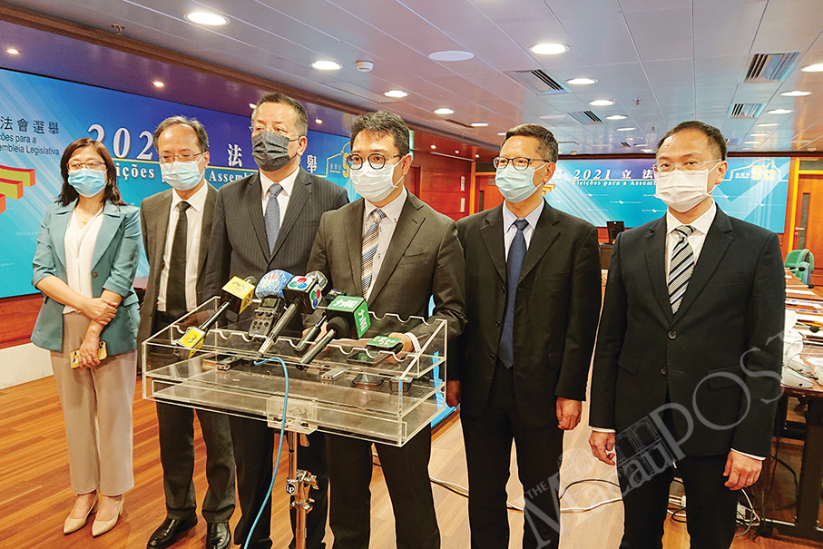 Legislative Assembly Electoral Affairs Commission (CAEAL) President Tong Hio Fong (third from right) briefs reporters yesterday after a closed-door meeting of the commission at the Public Administration Building in Rua do Campo, as fellow commission members Inês Chan Lou (first from left), Iong Kong Leong (second from left), José Maria da Fonseca Tavares (third from left), Lai U Hou (second from right) and Kou Peng Kuan look on. Photo: Tony Wong