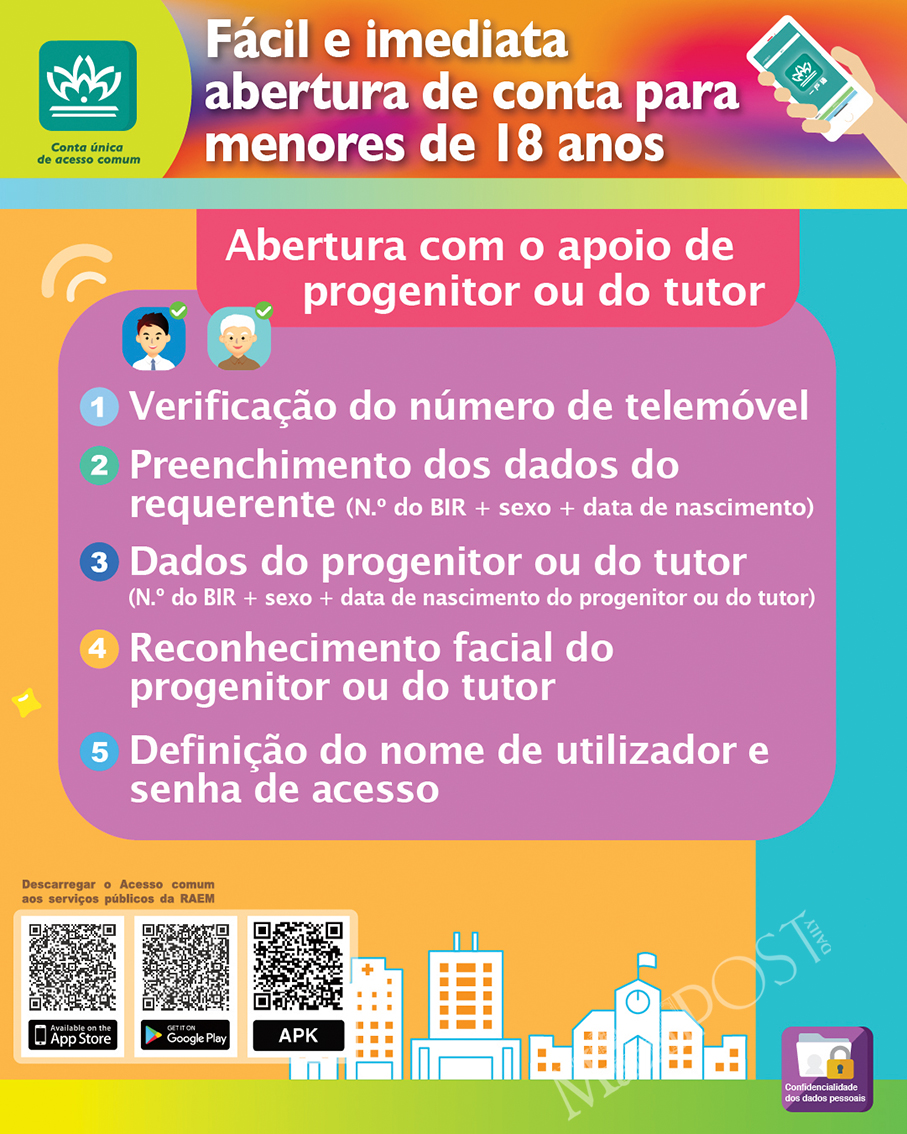 This poster explains in Portuguese the procedure for signing up for an account for minors on the “Common Access to Public Services of the Macau SAR” system. Photo: Public Administration and Civil Service Bureau (SAFP)