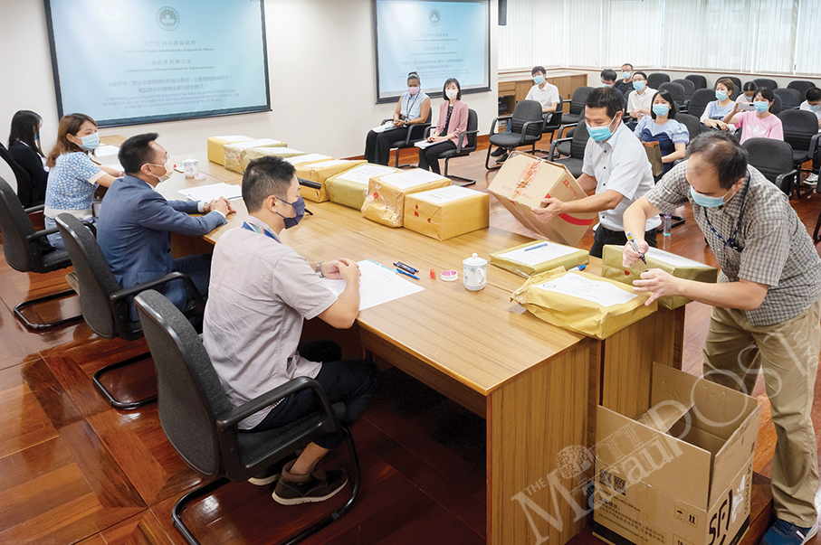 Infrastructure Development Office (GDI) officials unseal the bids submitted by 11 construction companies for the Light Rail Transit (LRT) Seac Pai Van section project, at the office in Zape yesterday. Photo: GCS
