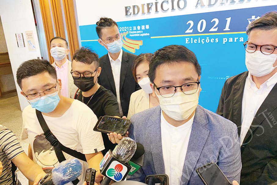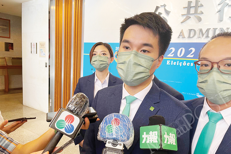 Current directly-elected lawmaker Sulu Sou Ka Hou (centre), who will seek re-election, speaks to reporters at the Public Administration Building in Rua do Campo yesterday after his electoral list New Macau Progressives submitted his political platform to the Legislative Assembly Electoral Affairs Commission (CAEAL), as the list’s second-ranked candidate Rocky Chan Lok Kei (right), and Kam Sut Leng, the president of the New Macau Association (NMA) – of which both Sou and Chan are vice-presidents – look on. Kam is not a candidate of the list.