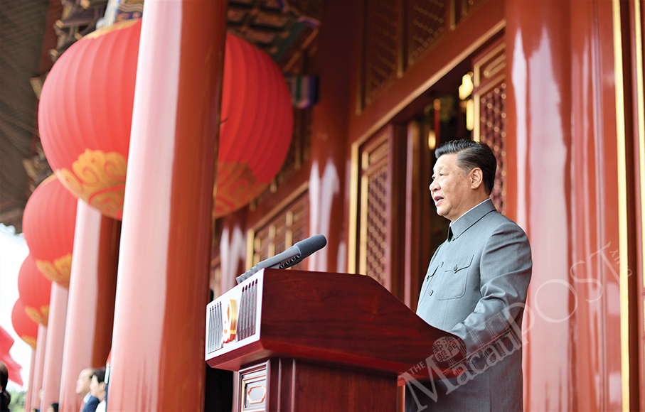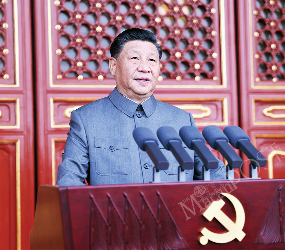 Xi Jinping delivers his historic speech during yesterday’s ceremony at Beijing’s Tian’anmen Square marking the centenary of the CPC as the chief executives of Macau and Hong Kong Ho Iat Seng and Carrie Lam Cheng Yuet-ngor (seen in the picture’s lower left corner) look on. – Xinhua
