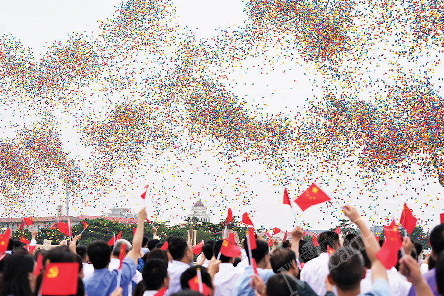 Citizens wave national flags as balloons are released from Beijing’s Tian’anmen Square during yesterday’s ceremony marking the centenary of the Communist Party of China (CPC). – Xinhua