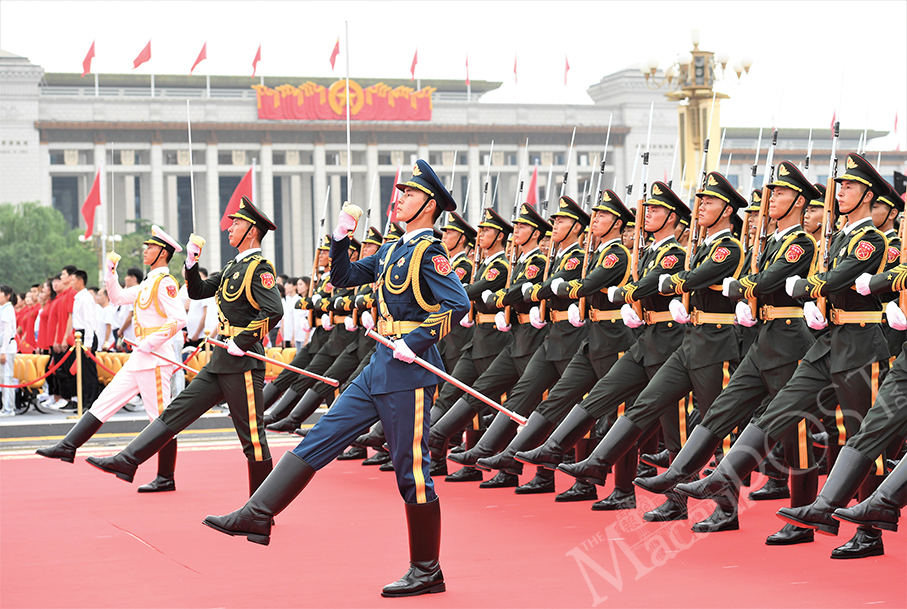 National flag guards march during a flag-raising ceremony at yesterday’s grand gathering celebrating the centenary of the Communist Party of China (CPC) at Tian’anmen Square in Beijing. – Xinhua