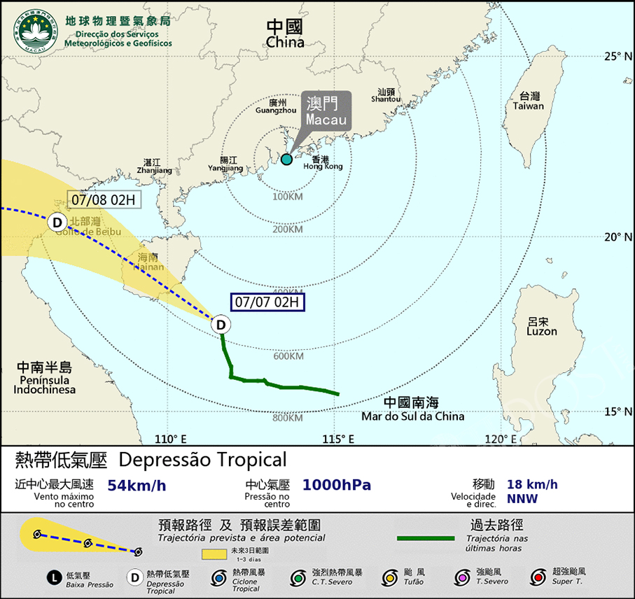 At 2 a.m. the tropical depression was located about 560 km south-southwest of Macau, moving toward Hainan province.