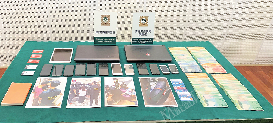 Evidence seized from the suspects such as a dozen smartphones, two computer laptops, one computer tablet, a number of SIM cards and bank cards is displayed at the Judiciary Police (PJ) headquarters yesterday.