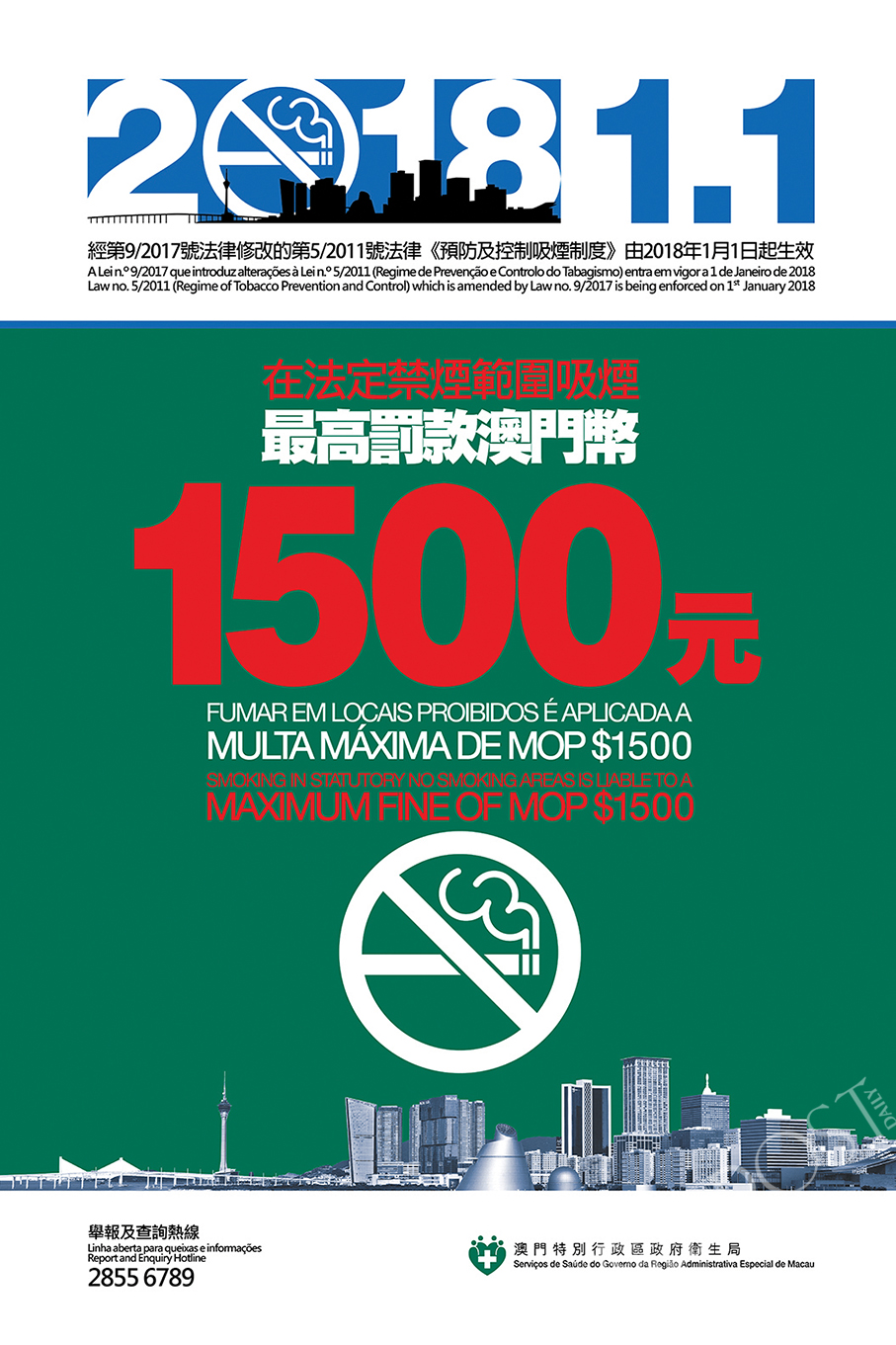 This Health Bureau (SSM) poster warns residents that illegal smoking carries a 1,500-pataca fine.