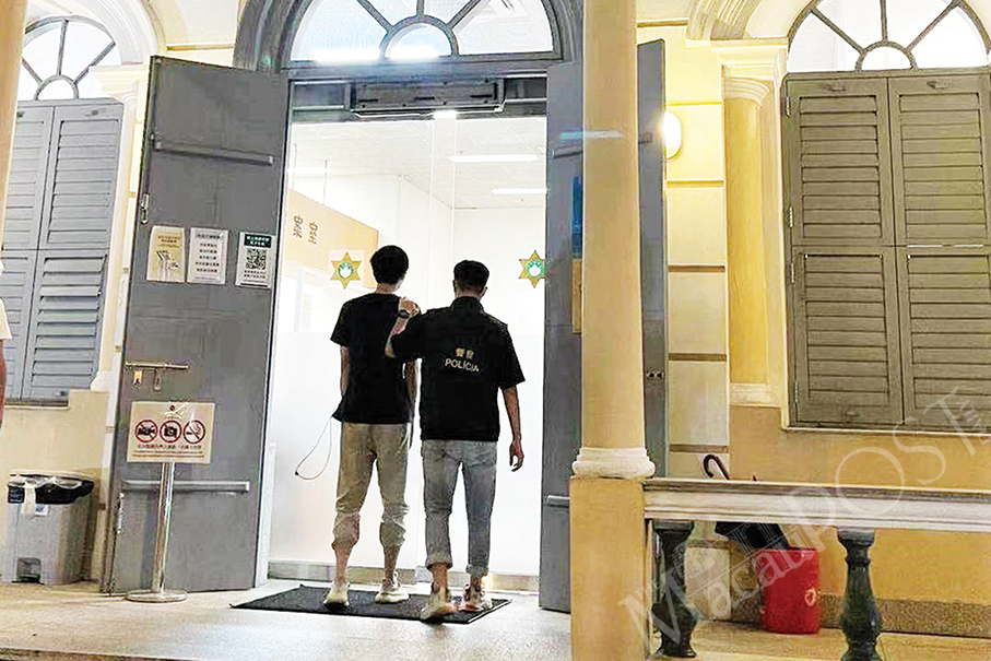 This undated handout photo provided by the Public Security Police (PSP) yesterday shows a PSP officer escorting the sexual harassment suspect to a police station.