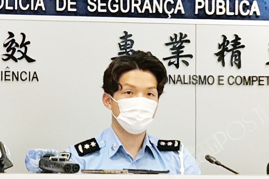 Public Security Police (PSP) spokesman Cheuk Kou Chi looks on during Monday’s press conference at the PSP press room.