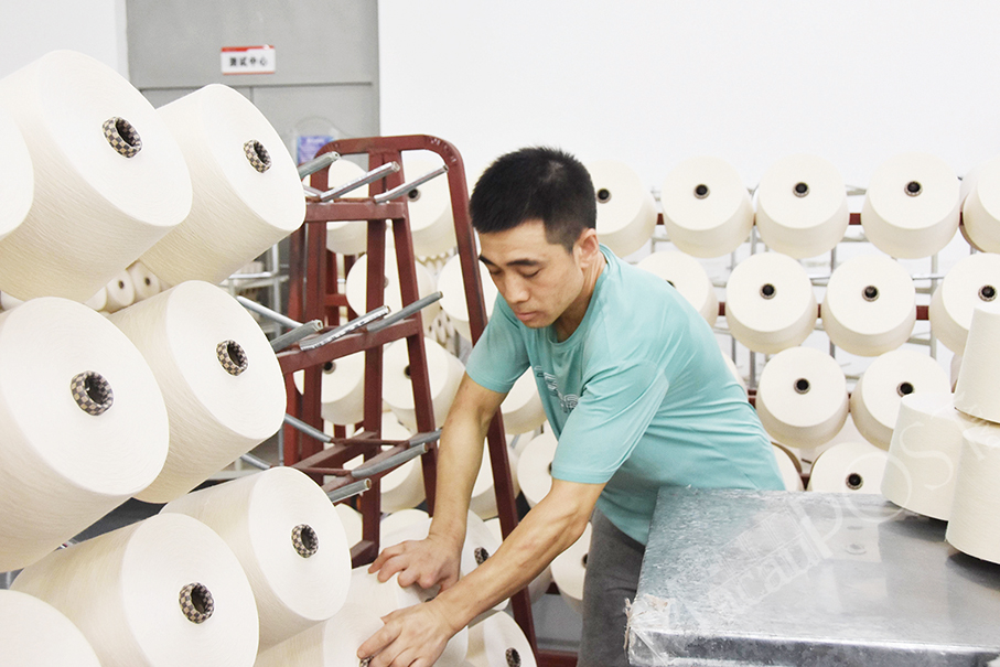 A worker packs spindles at a textile plant in Shihezi city, Xinjiang Uygur Autonomous Region, last week. – Xinhua