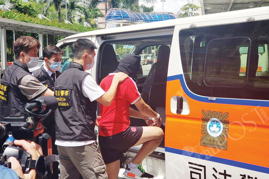 The theft suspect is being escorted by Judiciary Police (PJ) officers from the PJ headquarters to a PJ vehicle yesterday. Photos courtesy of TDM