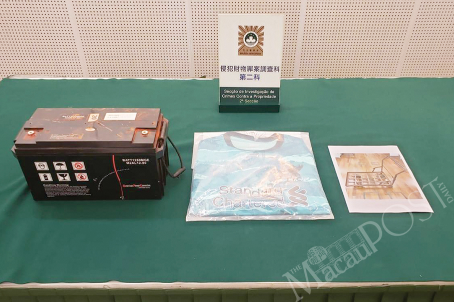 Evidence seized from the theft suspect such as a rechargeable battery and the clothes he wore when committing the theft is displayed during yesterday’s press conference about the theft case at the Judiciary Police (PJ) headquarters.