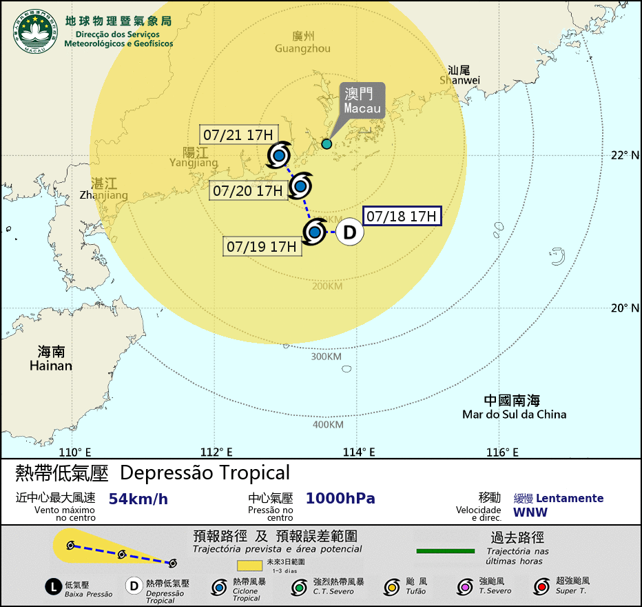 According to a statement by the Meteorological and Geophysical Bureau (SMG), a "slowly moving" tropical depression was located about 130 kilometres south-southwest of Macau at 5 p.m.