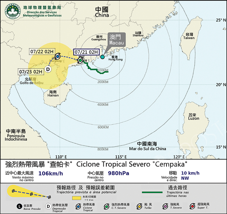 At 2 a.m. today, Severe Tropical Storm Cempaka was located about 190 kilometres west of Macau, moving northwest at around 10 km/h.