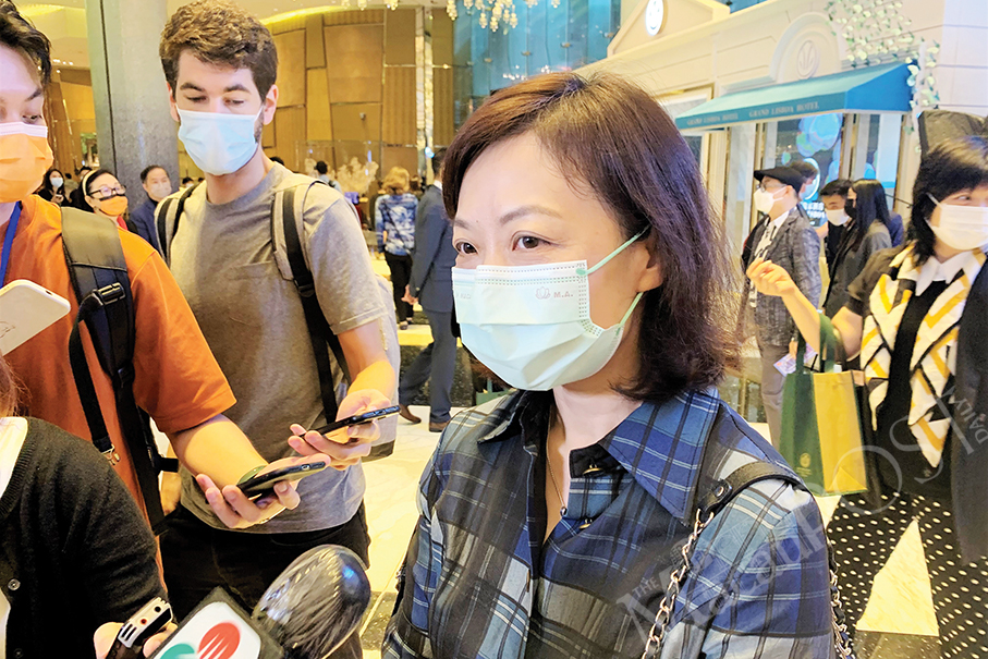 Cultural Affairs Bureau (IC) President Mok Ian Ian talks to reporters on the sidelines of yesterday’s launch ceremony for ‘SJM Resorts, S. A. Art•Creation•New Ambience – Transformative Thinking, Enter an Era of Extraordinary Breakthroughs’ at Grand Lisboa. Photo: Prisca Tang