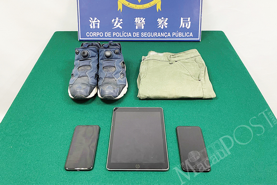 This undated handout photo provided by the Public Security Police (PSP) yesterday shows evidence seized from the suspect such as the clothes he wore when upskirting the woman, two smartphones, and a tablet computer.
