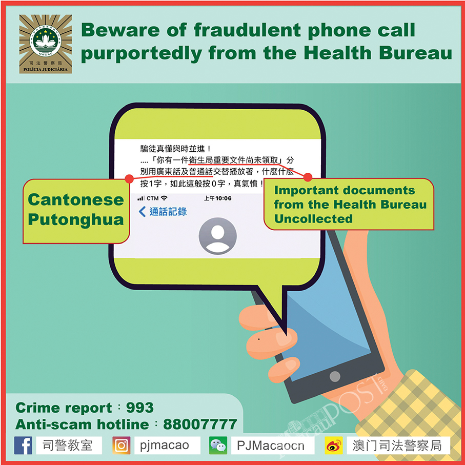 The Judiciary Police (PJ) have been notified by a local citizen that he or she received a call with a pre-recorded Cantonese and Putonghua voice message claiming that the recipient of the call had not yet collected important documents from the Health Bureau (SSM), according a PJ statement yesterday.