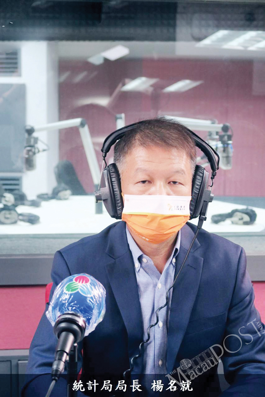 Statistics and Census Bureau (DSEC) Director Ieong Meng Chao attends a phone-in radio programme on the Chinese-language radio channel of public broadcaster TDM yesterday. Photo courtesy of TDM