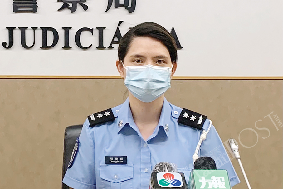 Public Security Police (PSP) spokeswoman Cheong Im Sim looks Wednesday’s press conference at the Judiciary Police (PJ) headquarters. Photo: Camy Tam