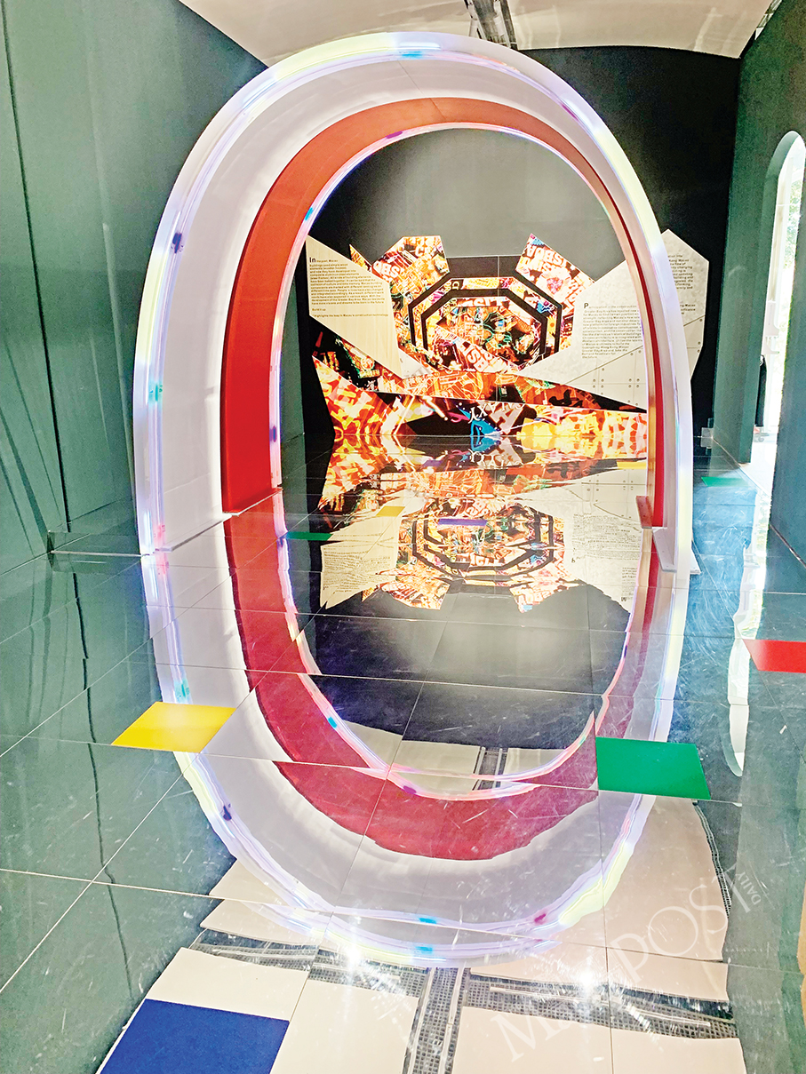The exhibition at the “Nostalgic House” in Taipa showcases work by Chan Ka Tat themed “Connected” which starts with the exhibition hall’s entrance to “the Greater Bay Area” and uses mirror platforms and arches made of twisted metal sheets to visually scale the proportion of people as if they are entering the pipeline to move around, the statement points out, adding that “the circular dynamic lights and squares of different colours represent that life is constantly flowing (moving from one point to another, just like the old-fashioned children’s game ‘hopscotch’ [跳飛機]), flying over different places where visitors can see different indoor installations.