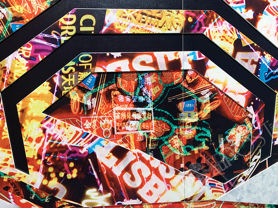 “The two panels on the wall are modelled after the shape of Macau’s Golden Lotus sculpture and are displayed in multiple layers with different building materials. It tells the story of Macau’s transformation from a fishing village, represented by the wooden houses, to a Westernised modern city, represented by metal and concrete. The level of Macau architecture especially in these 20 years after [Macau’s return to the motherland in 1999] has developed with a greater variety, gradually reaching world-class standard.”