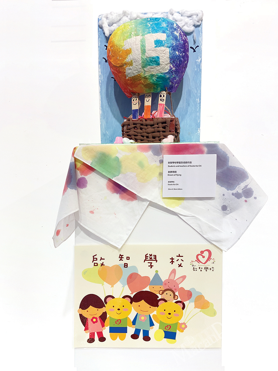 The exhibition showcases 44 artworks such as paintings, ceramics, handicrafts and collages by students from Kai Chi School (啟智學校), Kai Chi Initial Training Centre (啟智早期訓練中心), Kai Lung Vocational Centre (啟能中心), Kai Hon Centre (啟康中心) and “Sam Meng Chi” Snack House (心明治小食店). The pieces were done under the guidance of mentors who every day encourage these “special young people to overcome their disabilities through the arts”, according to a statement on the gallery’s website.
