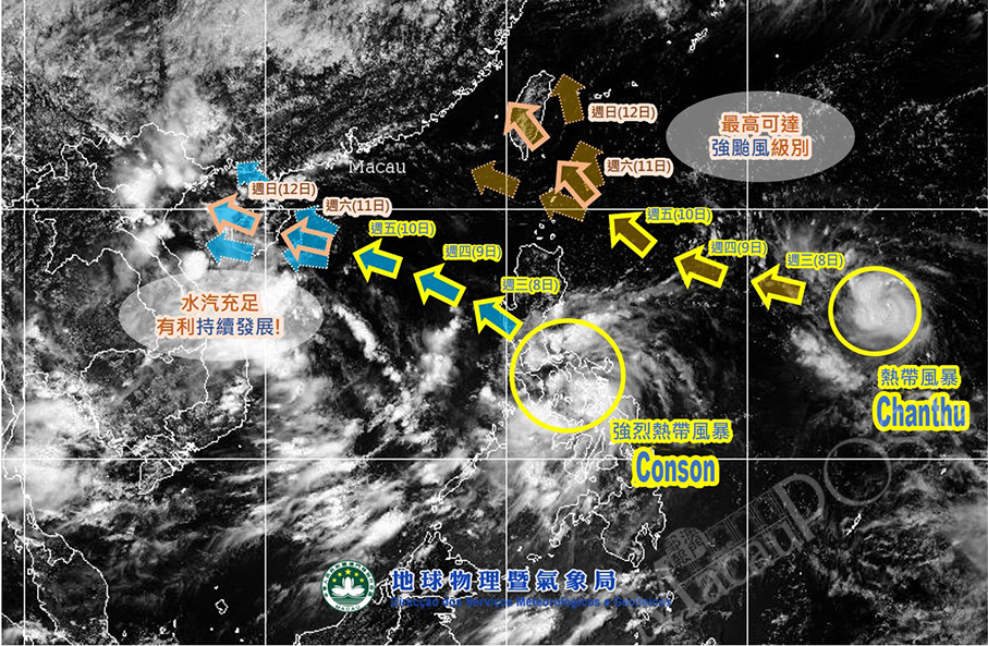 This map provided by the Macau Meteorological and Geophysical Bureau (SMG) last night shows the respective locations of tropical cyclones – Conson and Chanthu – and their predicted paths over the next few days.