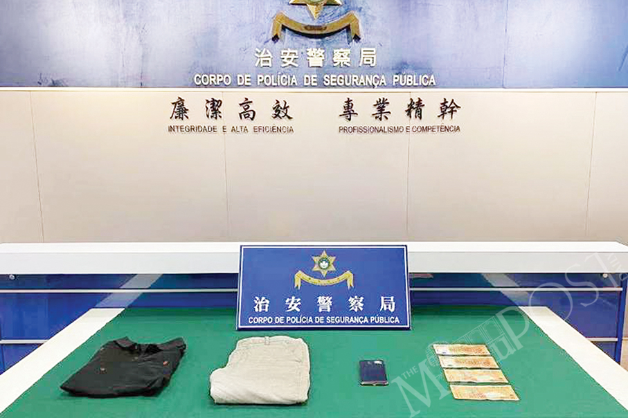 This undated handout photo provided by the Public Security Police (PSP) yesterday shows evidence seized from the suspect such as 4,000 patacas in cash, a smartphone and clothes which the suspect wore when the theft was committed by his female accomplice.