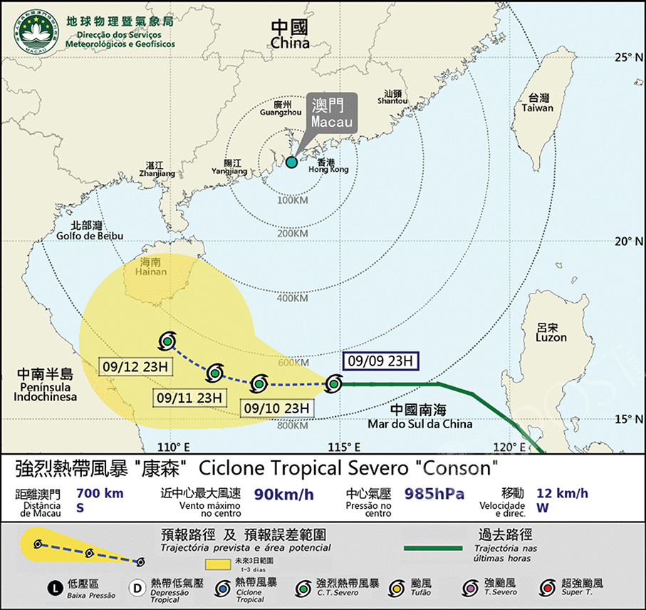 Severe Tropical Storm Conson is forecast to move westwards across the South China Sea towards the vicinity of Hainan province and keep a distance of 600 kms from Macau, the Macau Meteorological and Geophysical Bureau (SMG), which hoisted the Stand-by Signal No. 1 at 6 p.m. yesterday, said in a statement last night.
