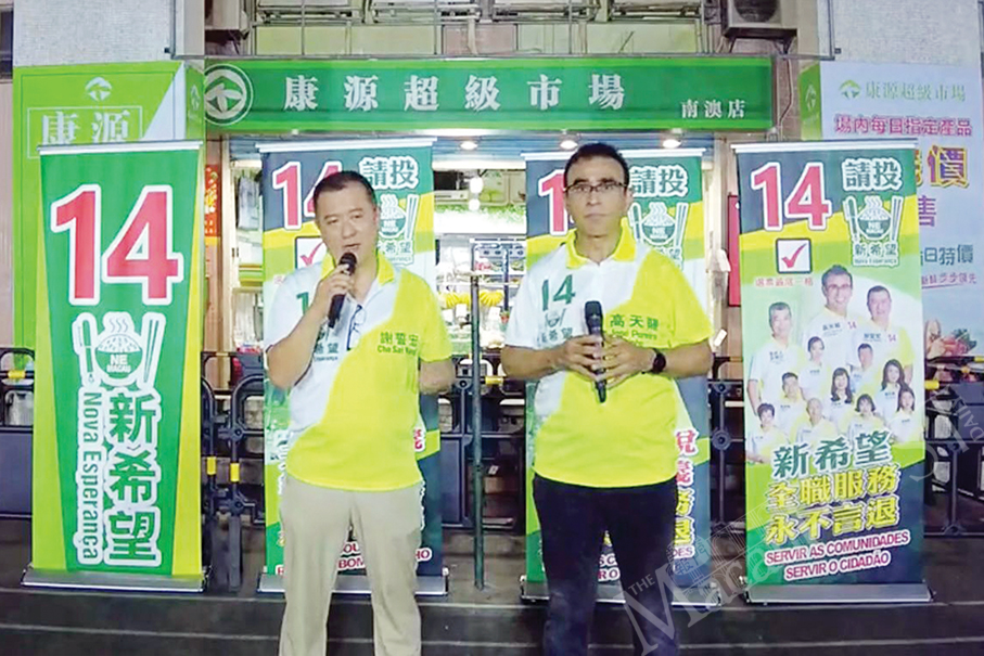 The number-two candidate of the New Hope direct-election list, Che Wai Sang (left), speaks during a campaign activity outside a supermarket in Areia Preta district earlier this month, as the number-one candidate José Maria Pereira Coutinho looks on. Photo: MPDG