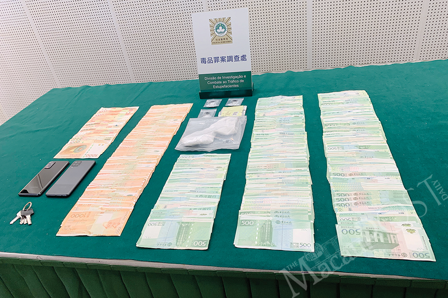 According to Lou, about six packets containing six grammes of ketamine in total, a packet of cocaine weighing one gramme worth about 10,000 patacas and suspected “drug money” of HK$23,000 and 203,000 patacas in cash were found in the suspect’s flat in Toi San later that day.