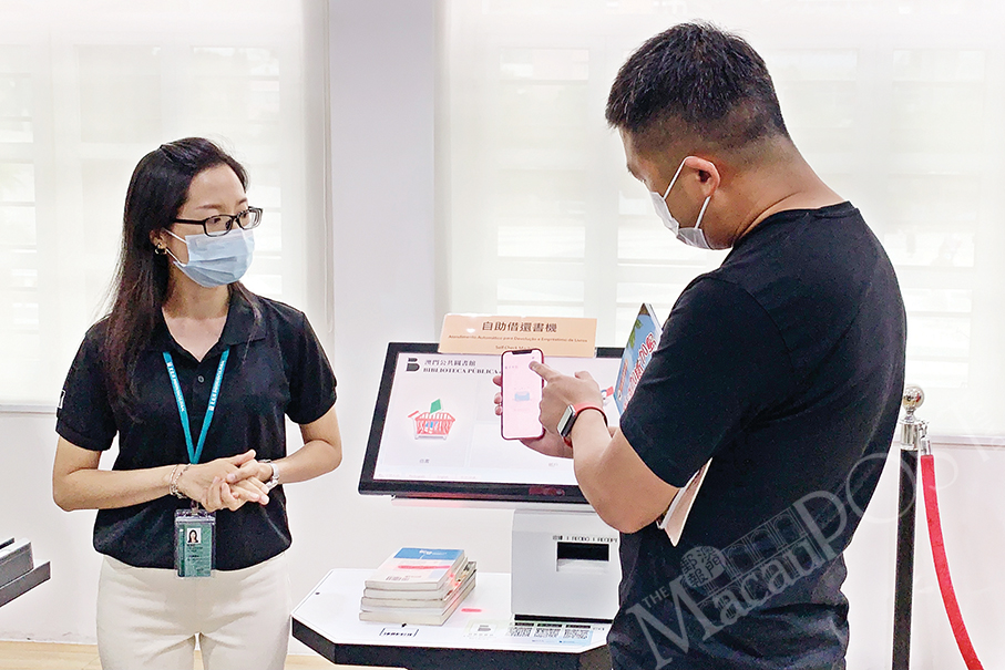 Two library staff members demonstrate how to use the new e-version of the Public Library Reader Card yesterday at the Central Library in Praça do Tap Seac. Photo: Prisca Tang