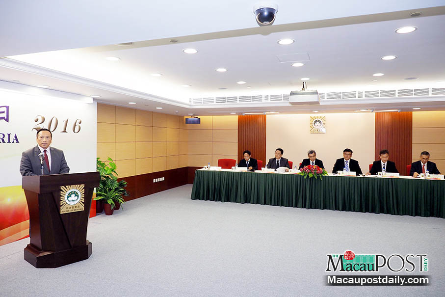 Judiciary Police (PJ) Director Chao Wai Kuong (left) addresses an award ceremony commemorating the 56th anniversary of the Judiciary Police at the PJ headquarters in Zape yesterday. Photo: Iong Tat Choi