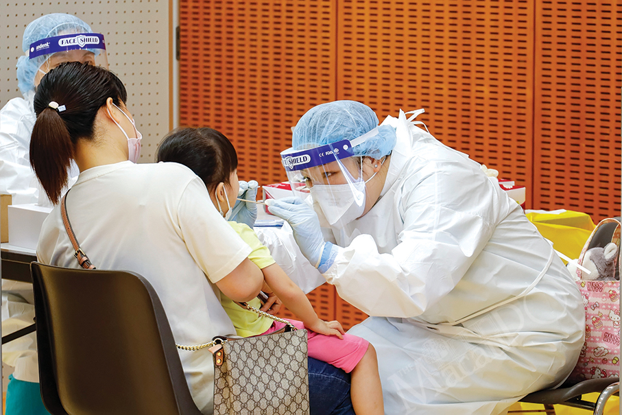 A health worker takes a swab from a girl for a COVID-19 test at one of the government’s testing stations under its ongoing three-day mass nucleic acid testing (NAT) drive on Tuesday. Photo: GCS