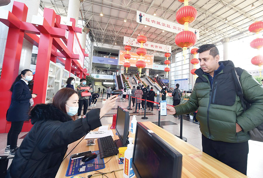 A foreign merchant shows his QR code to a receptionist at the Yiwu International Trade Market in Yiwu city, Zhejiang province, in February 2021. – Xinhua