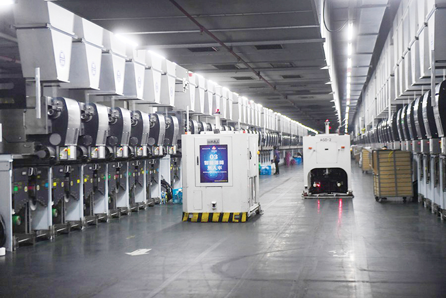 A 5G robot moves textile products in a factory of Xinfengming Group in Huzhou city, Zhejiang province, in March 2021. – Xinhua