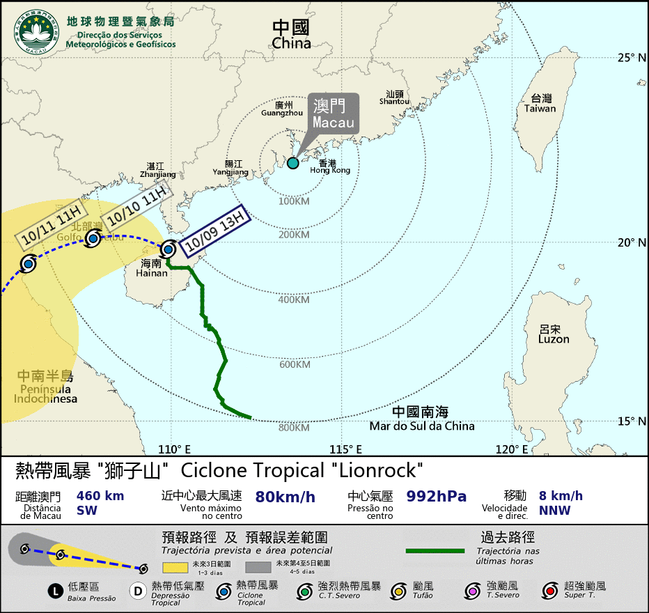 At 1 p.m., Tropical Cyclone "Lionrock" was located at about 460 km southwest of Macau, approaching Beibu Gulf, the Macau Meteorological and Geophysical Bureau (SMG) said.