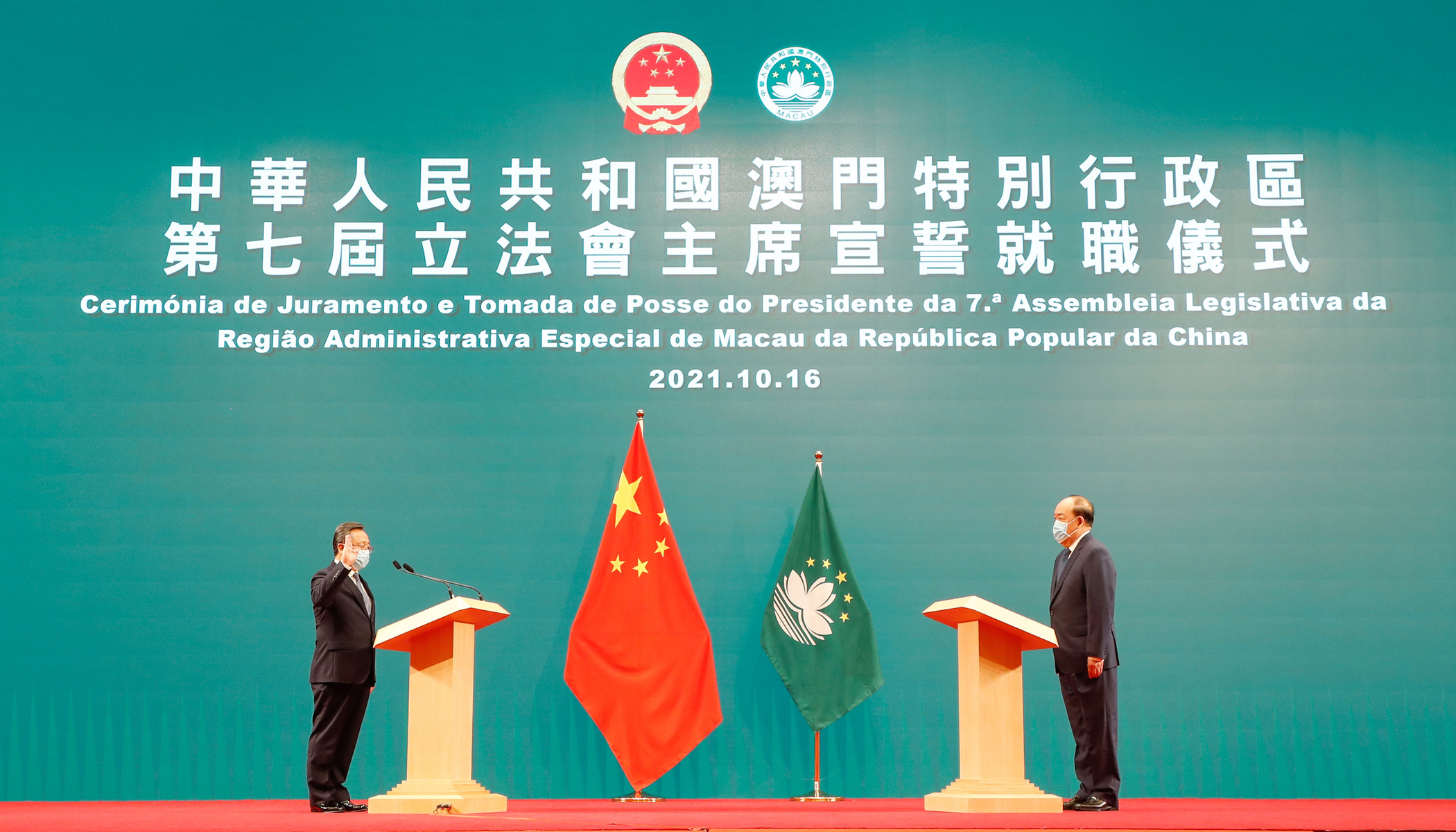 Before the elections by secret ballot in the legislature's hemicycle, the 33 lawmakers were sworn in on Saturday morning by the chief executive during a brief ceremony held at the nearby China-Portuguese-speaking Countries Commercial and Trade Service Platform Complex, where Kou was sworn in by the chief executive as president (speaker) of the legislature shortly after his re-election in the afternoon.