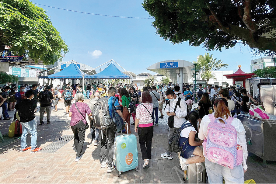 Scores of visitors entering Macau via the Barrier Gate checkpoint on Tuesday after Zhuhai lifted its 14-day mandatory quarantine for arrivals from Macau. Photo: MPDG