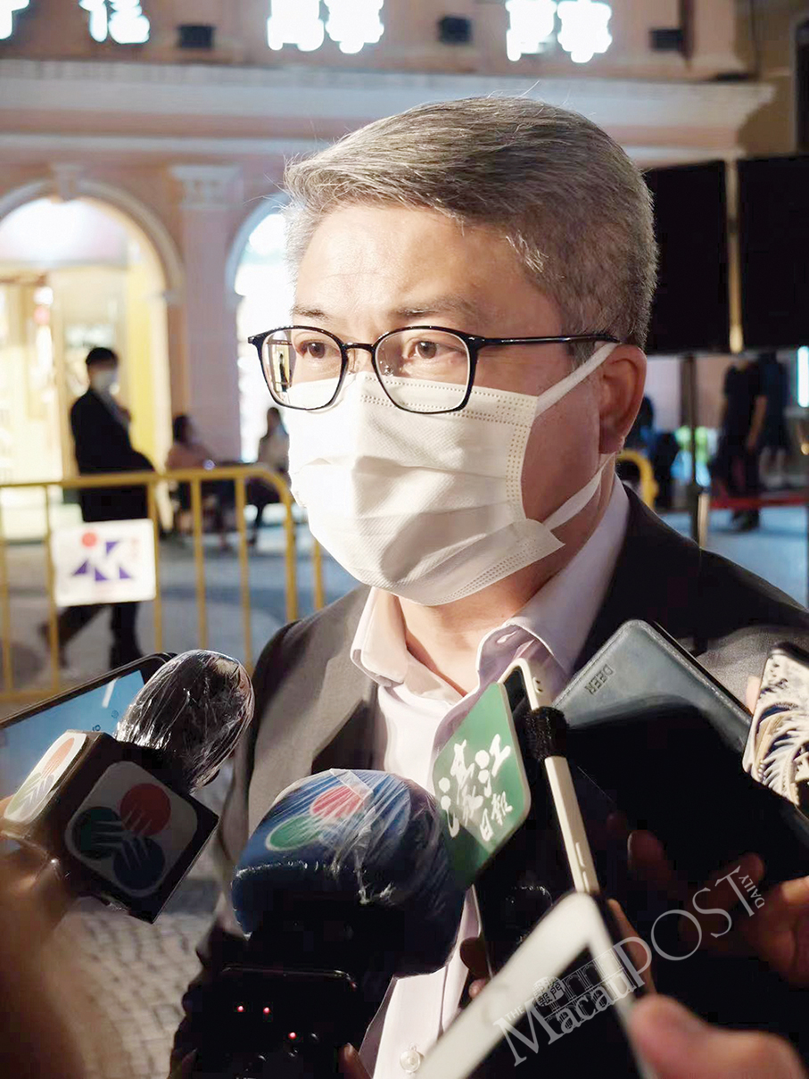 Sports Bureau (ID President Pun Weng Kun speaks with reporters after the launching ceremony for the 100-day countdown timer of the Beijing Winter Olympic Games in Largo do Senado last night.