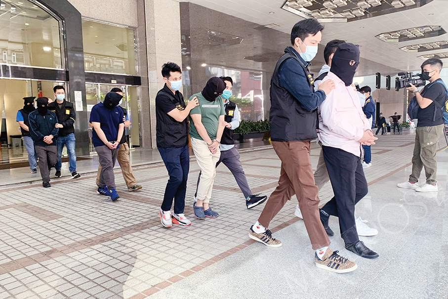 Five hooded health voucher fraud suspects are escorted by Judiciary Police (PJ) officers from the PJ headquarters in Zape to a vehicle yesterday. Photo: Camy Tam
